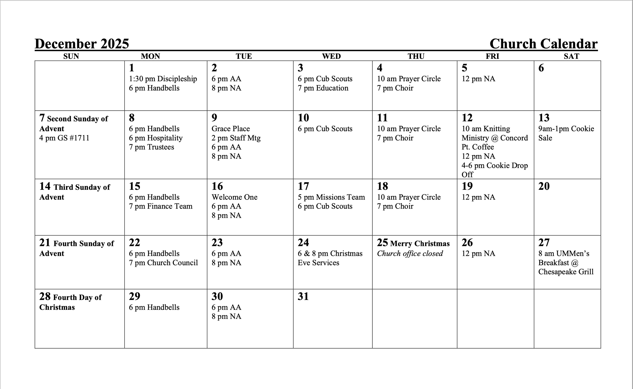 Ruth Jessup Circle Annual Christmas Cookie Sale takes place in the Social Hall from 9:00am until noon. Stock up on treats for the holidays!